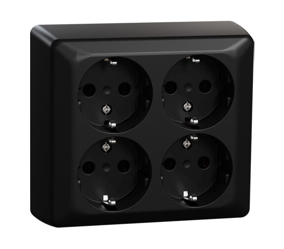 RS sort 4-veis stikkontakt med jord. Stikkontakten leveres med termoplastkappe, bakplate og barnevern.