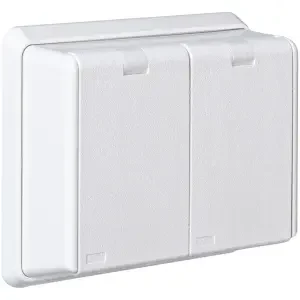 RS dobbel innfelt sprutsikker stikkontakt med klapplokk og barnevern. Monteres i enkel veggboks. Med isatt plugg gjelder den laveste IP-grad som inngår i kombinasjonen plugg og stikkontakt. Vær oppmerksom på at tettekappen må monteres før kabel termineres i stikkontakten.