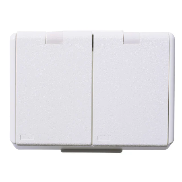 RS påvegg dobbel IP44 stikkontakt med klapplokk og barnevern. Leveres med membrannippel med enkel og dobbel gjennomføring. Membranen bør punkteres med kabel.