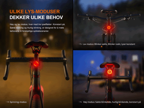 Med det innebygde 560mAh-batteriet og den medfølgende USB-C-ladekabelen, løser lyset effektivt problemer med lavt batteri som ofte oppstår under langdistansesykling. Denne baklykten tilbyr en maksimal effekt på 90 lumen og flere lysmoduser for forbedrede sykkelopplevelser.