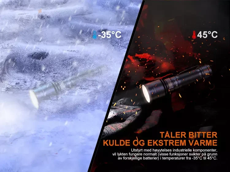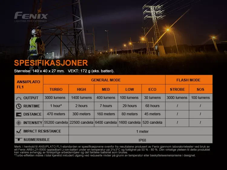 Gir en effekt på opptil 3000 lumen i turbo-modus mens den kaster strålen en avstand på opptil 470 meter.