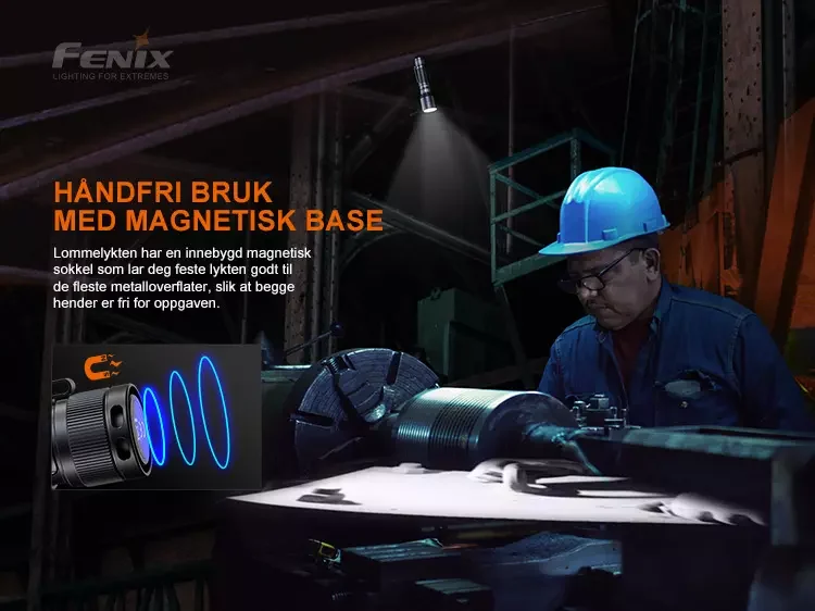 Den magnetiske basen er perfekt for håndfri bruk, for å feste lommelykten til en metalloverflate i nærheten.