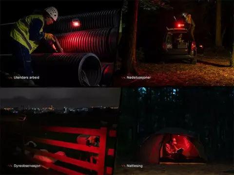 Med en kombinasjon av flomlys, spotlight, spot-og-flomlys og rødt lys, kan brukere bruke denne allsidige lanternen for belysning av store områder, langdistansebelysning og varsling.