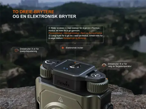 Denne lykten har to roterende brytere som muliggjør trinnløs justering av lysstyrke og fargetemperatur.