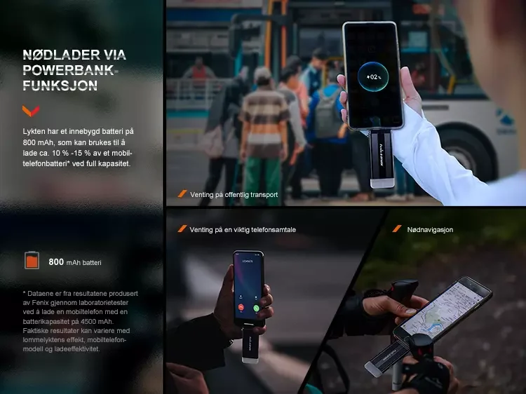 Lad opp lykten via USB-C-ladeporten. Lykten er i stand til å lade mobiltelefonen din i nødstilfeller.