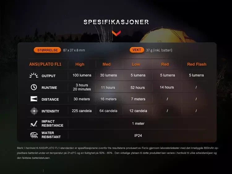 Det innebygde 800mAh-batteriet gir den en maksimal effekt på 100 lumen.