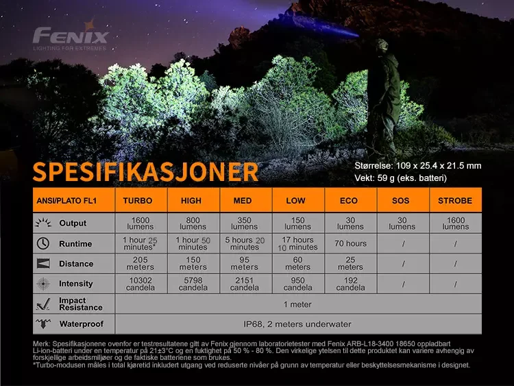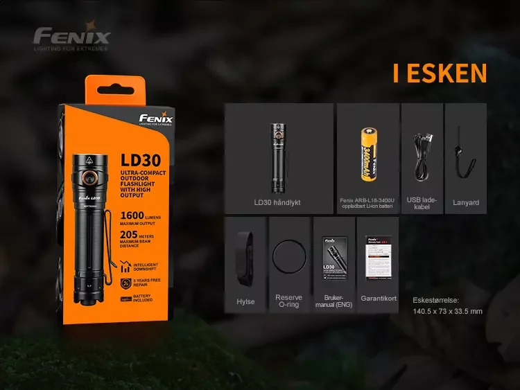Fenix Håndlykt LD30 er en meget kraftig lykt som gir hele 1600 lumens og kan kaste lysstrålen opptil 205 meter.