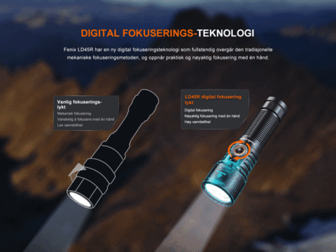 Fenix LD45R er en høyytelses håndlykt som kombinerer fokusering av lysstrålen med en OLED-skjerm for maksimal kontroll og brukervennlighet.