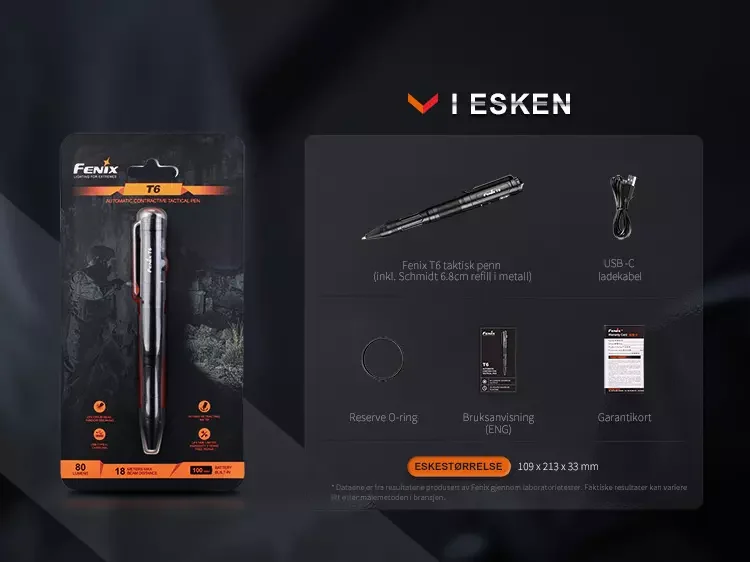Fenix T6 Taktisk Lyspenn Sort er en multifunksjonell taktisk penn som er i stand til å lyse opp, knuse vinduer og skrive.