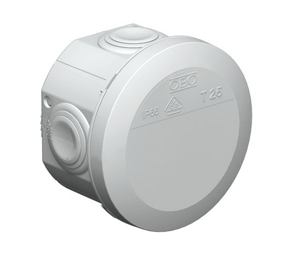 Kabelforgreningsboks T-serie med innføringer. halogenfri. For kabeltverrsnitt 2.5mm², innføring 4xM25. IP65. ØxD: 80×51 mm.