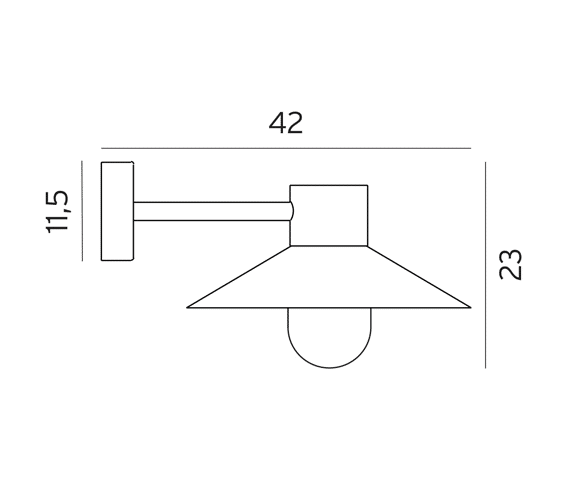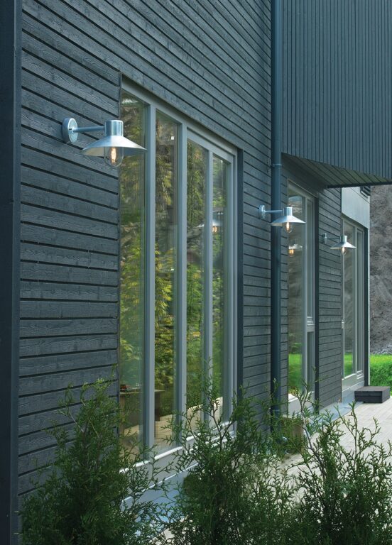 Moderne vegglampe. Klar polykarbonat. Hjørnefeste (art. 153) kan bestilles som tilbehør. Lund finnes i fargene galvanisert stål og sort.