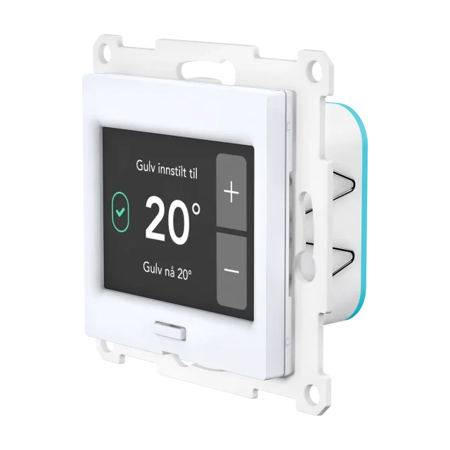Termostat med romføler og gulvføler for elektrisk gulvvarme opp til 16A. Passer med Exxact ramme.