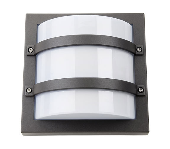 Kvadratisk veggarmatur med dekorative beskyttelsesbøyler for utendørsbruk. Armaturen er utført i trykkstøpt aluminium, pulverlakkert sort, hvit eller grafitt, samt galvanisert, med skjerm i UV-stabilisert opal polykarbonat. Versjoner med skumringsrelé tilgjengelig. Enkel montering med hurtigklemmer, to inn-/utganger for kabler, med mulighet for både skjult og synlig kabling. Beskyttelsesklasse IP65, slagfasthet IK10.