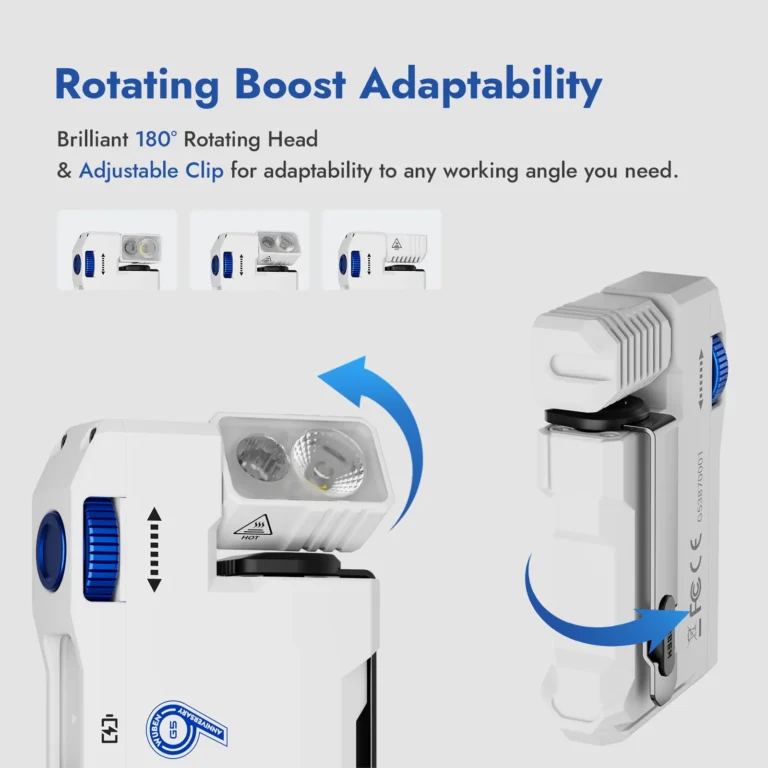 Det roterbare hodet (180°) og den justerbare klipsen gjør det enkelt å bruke lyset handsfree, enten du jobber i trange rom eller går tur i mørket.